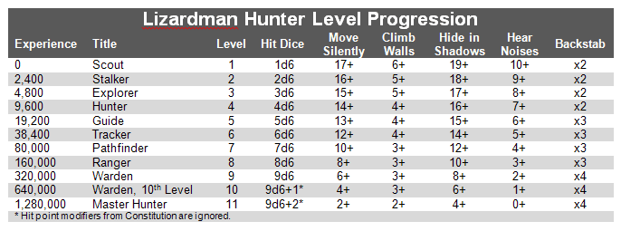 Lizardmen Hunters may Move Silently, Climb Walls, Hide in Shadows, Hear Noise and Backstab like a Thief, as shown in the table below. The bonus for their Hunter's Senses is already factored in the throws given in the table.